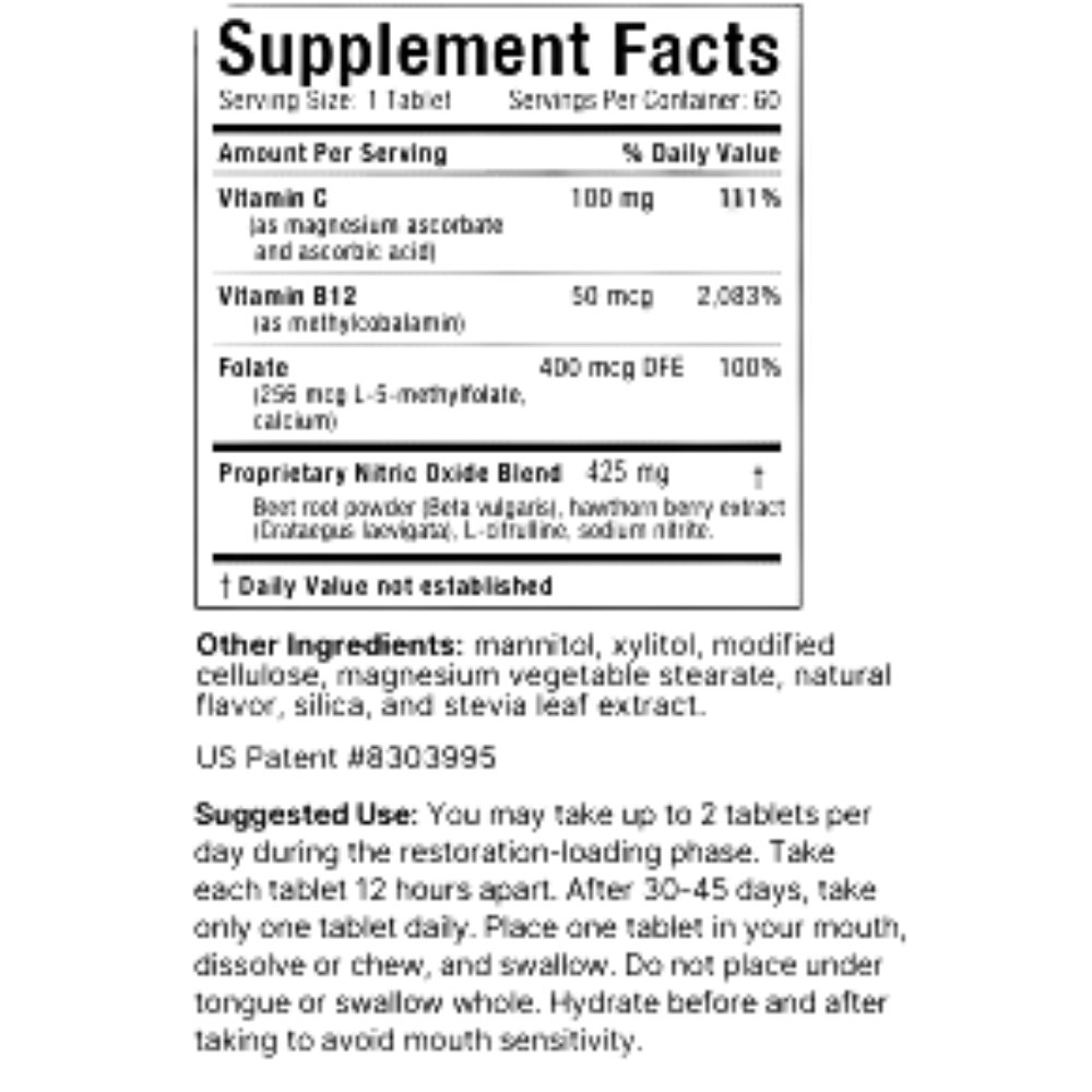 Clinical strength nitric oxide restoration formula, with added methylfolate for increased efficacy. Patented, quick-dissolve tabs clinically proven to generate nitric oxide in the mouth. The biphasic mechanism of action provides an immediate, rescue source of NO as well as a reserve pool of nitrate and nitrite, which the body can convert to NO in the endothelium as needed.