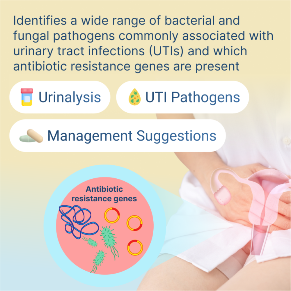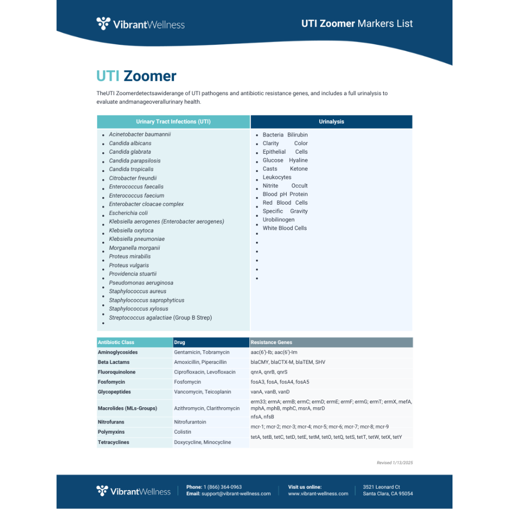 The UTI Zoomer is a comprehensive urine-based test that detects a wide range of urinary tract infection (UTI) pathogens, including bacteria, fungi, and antibiotic resistance genes. Utilizing advanced PCR and immunoassay technology, this test provides early detection and precise insights into UTI causes and resistance, helping guide targeted treatment and improve patient outcomes.